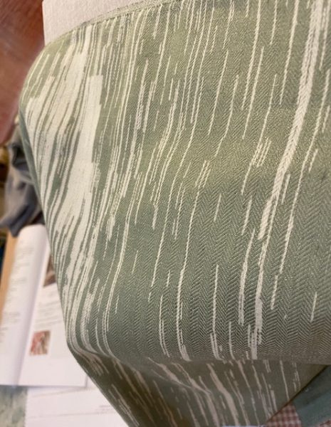 ヘリンボーン生地に施されたデザイン。こちらの生地は抜染技術(後から色を抜く方法)を用いてデザインをより際立たせているんです!
