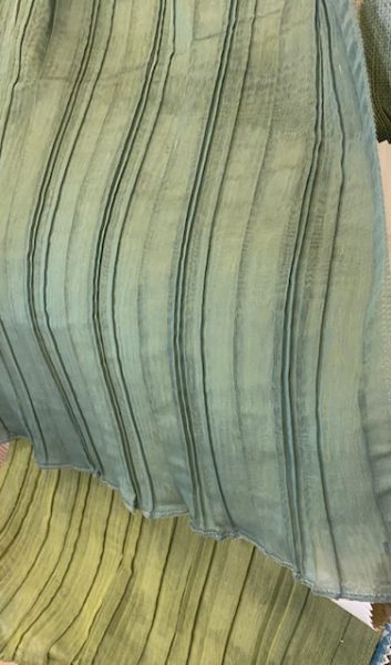 ヤシの葉の構造にインスパイアされたプリーツ加工。リバーシブルでお使いいただけるんです!気分に合わせて色をかえられる・・・そこが面白いですよね!広巾織りの生地です。