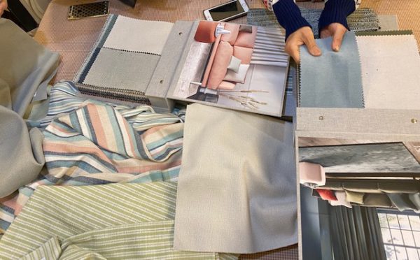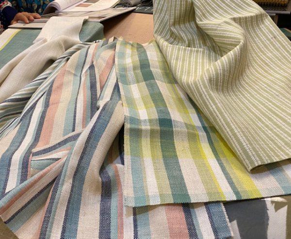 サンプルを見せていただきながら、巾なりサンプルを触り、何に使えるか・・・色は光が当たるとどうなるか・・・お客様はどの素材・デザイン・手触りを求められているのか・・・どの生地がリサブレアらしいか・・・などを考えながら店舗に置く生地をセレクトしていきます。Ostaraはスタッフで選んだ、お客様に是非ご覧いただきたい生地をハンガーサンプルで、チェック&ストライプ「Maranta」はカラーバリエーションも豊富なのでサンプル帳で置きます!(まだ少し先になりますが・・・)