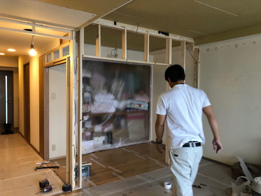 リビングのドアの位置も変えたのですが、廊下側にも洗面所につながるドアがありましたが、このドアはあきらめていただき、不便かどうかしばらくシュミレーションしていただきました。和室の境の建具も本来ならばもう少し高くしたほうがいいかもしれないのですが、収納側のハンバーパイプの高さ上にあわせ、上部の収納の大きさをとりました。