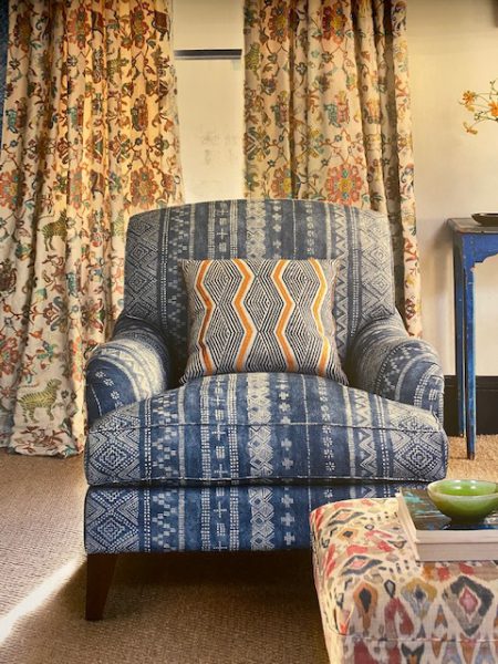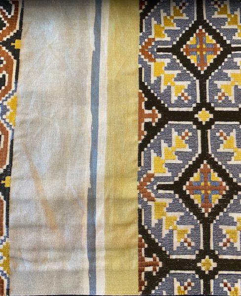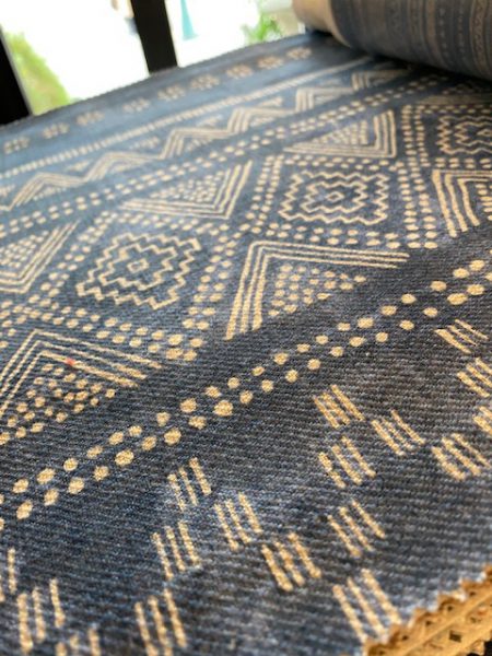 模様は少し幾何学的な要素も取り入れて、男性に好まれるような感じを受けますが、ブルーが所々色落ちしているのがこの生地のイメージを柔らかくしています。
