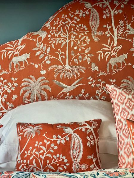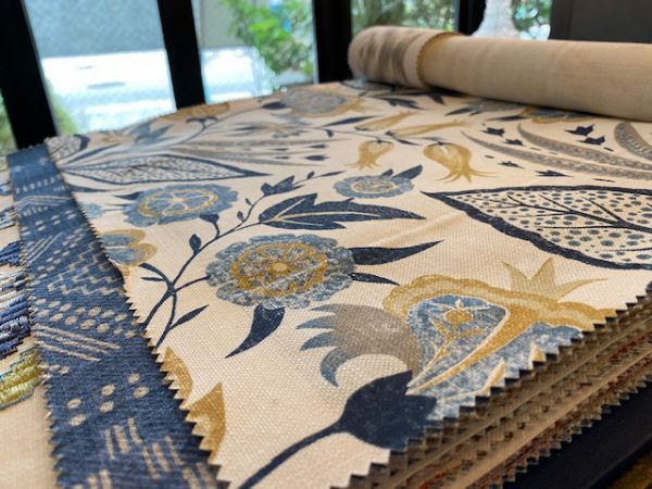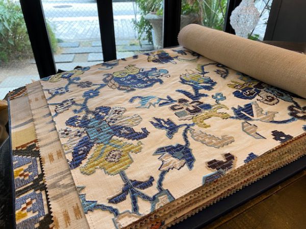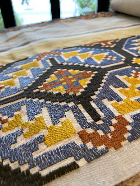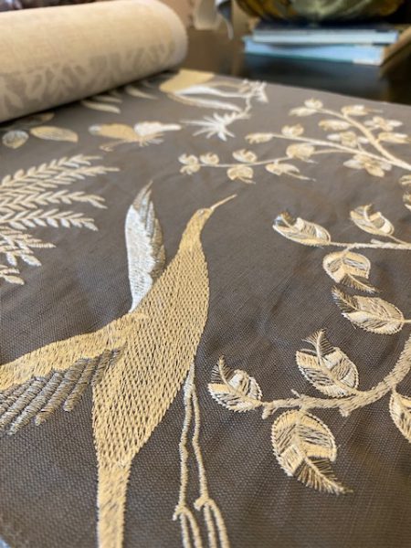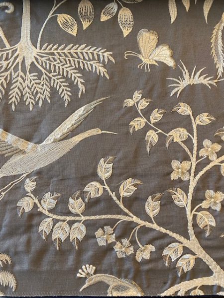 プリントと刺繍の融合。プリントで使われている色を刺繍の糸でも使っていますね!カーテン?パネル?クッション?何を作ろうとワクワクさせてくれる・・・そんな生地です。