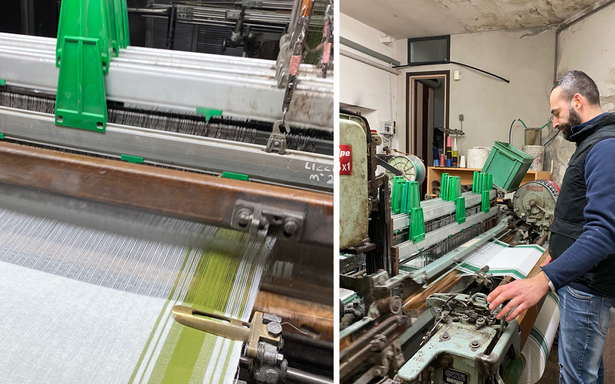 そんなステファノに連れられ、最初に向かったのは街のレストラン。もちろんテーブルに敷いてあるのはブサッティの生地。そして右の女性が着ているのはブサッティのエプロンです。洗練されたイメージが強いのですが、こうやってイタリアの家庭に馴染んでいるんだなと想像する事ができ、愛されている理由が良く分かります。5年10年と毎日使い洗濯しながら使い込まれた生地。質の保証は実際に使っているところを見れるので説得力があります(笑)