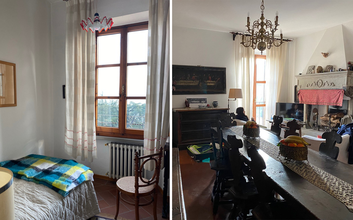 下の写真は、ひと昔までブサッティ家が住んでいたお部屋で、私たちのゲストルームでした。置いてある全てのものが高品質なアンティークと言った感じでしたが、ブサッティの生地がインテリアに使われる事で、軽やかさがプラスされ大変居心地の良い空間でした。両方の部屋に掛けられているのは、これまた数十年前のリネンカーテンです。リネンは、耐光性が非常に弱く私たちとしては質を保証できない怖さがあるのですが、ブサッティなら問題ないことをここでも確信!