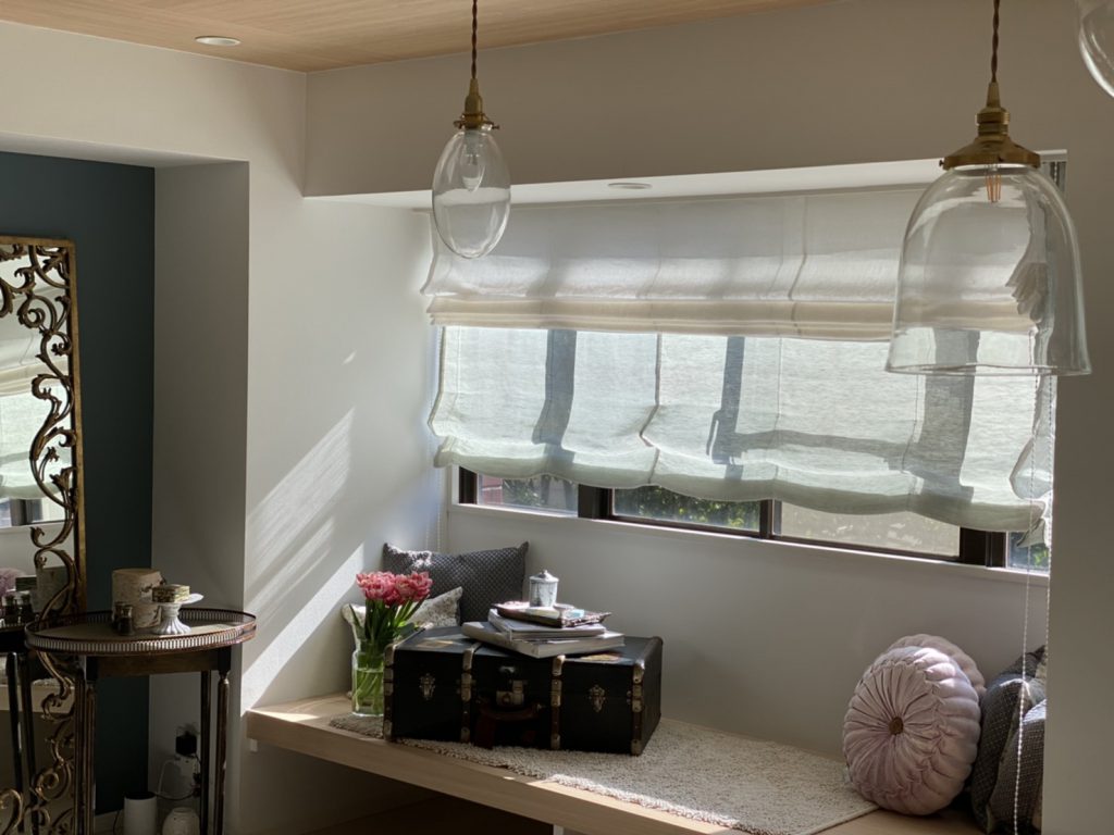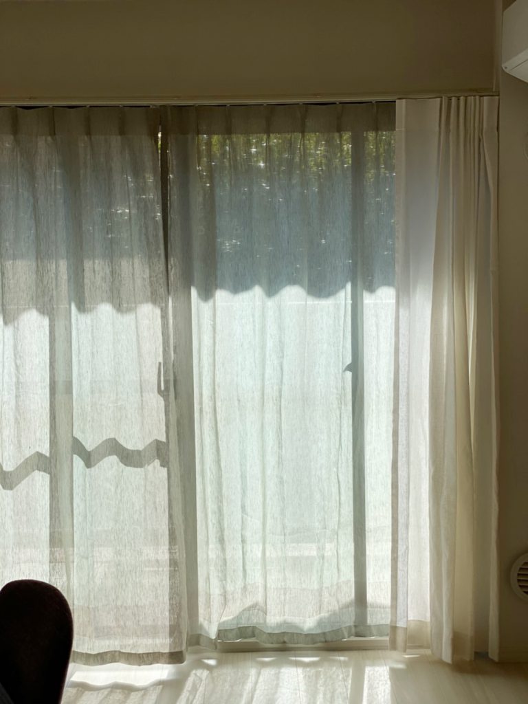 神戸から東京に引っ越されてから1年経った頃、昨年末に「東京内でお引越しする!」とのご連絡がありました。1年前につくったリネン生地のカーテンをとっても気に入って頂いており、そのカーテンを寸法直し、新しいお家の窓に合わせて再度縫製しました。