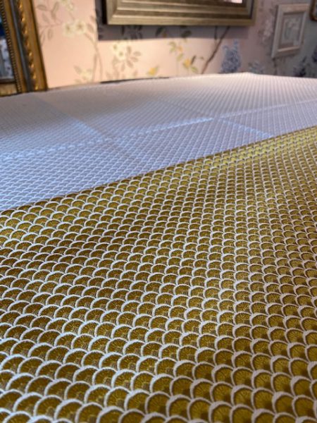 このブログを書くためにお店の入り口で生地をテーブルに並べて写真を撮っていました。そんな時にご来店いただいたM様。