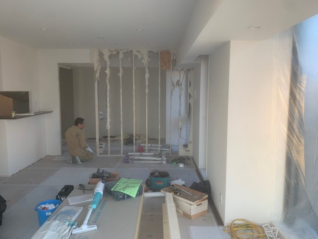キッチン横の壁を取り除いている様子。壁の下地を見ることは少ないかと思いますが、「壁」の構造はこのようになっています。
