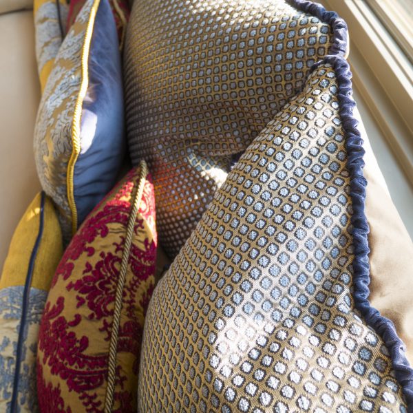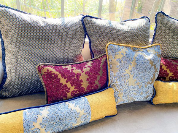 クッションコーディネートは、カラー数が多くてもバラバラの印象にならないよう、少しづつリンクするように組み合わせています。