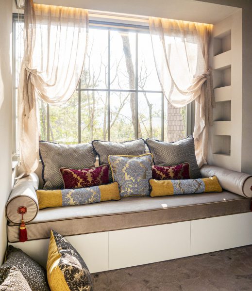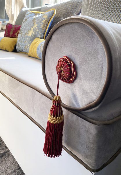 リサブレアで出会ったHopke社の「Epoque」シリーズの生地を気に入ってくださり、贅沢に組み合わせてお部屋の主役にすることに!