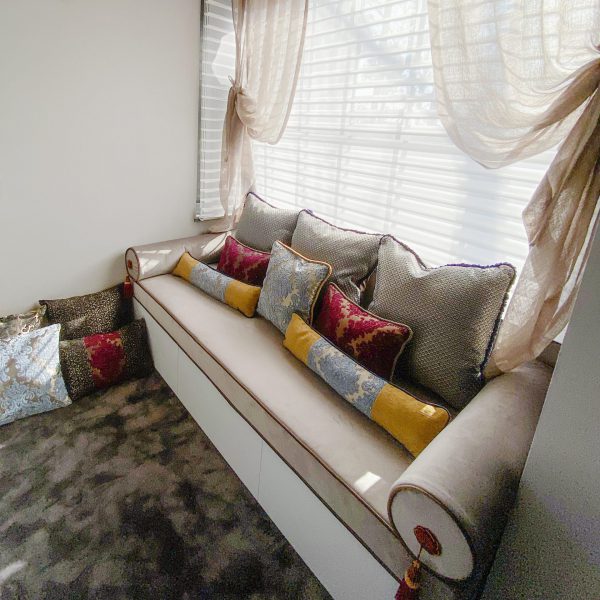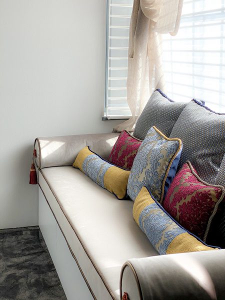 そしてシートと同生地でボルスタークッションを大きく両側に肘掛風に配置することで、まるでシートと一体のソファのようにも見せています。