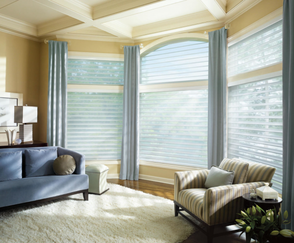 ウィンドウトリートメントは、ハンターダグラスのシルエットシェード&飾りレースカーテンのレイヤードスタイル。