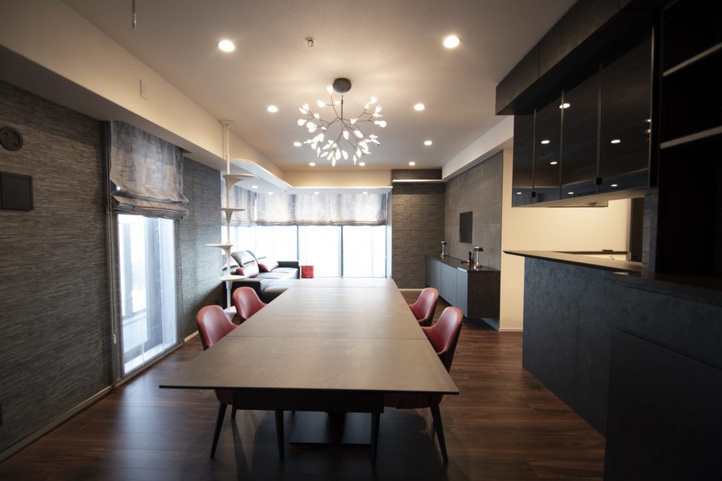 ブラックとレッドの何とも言えないモダンで個性的な空間。このレッドの椅子は猫ちゃんがいるので座面は合皮、背面はお客様が一目惚れされたイギリスのJANEN CHURCILLの生地。お客様のセンスの良さが光ります。合皮は椅子自体の機能性がある上にインテリアとしてもアクセントになるので、デザインとして2種の生地を組み合わせる事は、私たちが得意とするところです。