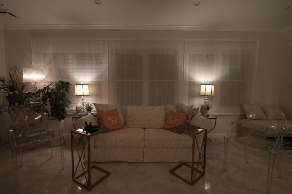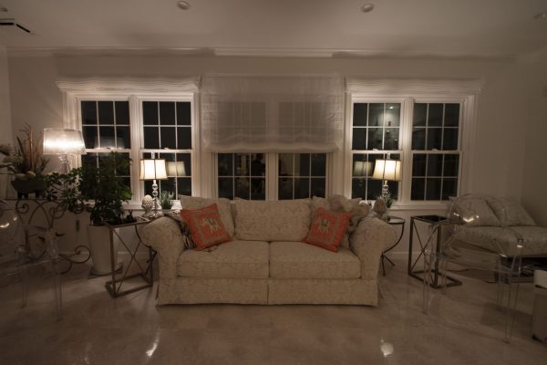 お客様とのお付き合いは長年させていただくことが多く感謝の気持ちでいっぱいです。以前はお母さまのおうちをさせていただき、そしてその20年後にお嬢様のおうちをリフォームさせていただいたり、今回のお客様は13年前に新築のコーディネートおよび家具カーテンをさせていただき、今回は一部装飾品家具、ワンちゃんルームの床張替えなどをさせていただきました。その写真はまだアップできないのですが、施工で夕方になり回りも暗くなったところで撮影をさせていただきました。右側にみえているシートクッションは下部が収納できるようになっていて、ゴールド色でさせていただきましたが、しっくり来ていますね。ソファを置くには狭いけれどというスペースにはピッタリです。ソファやランプは13年前に納入させていただいたもの、そして一部シートクッションとサイドテーブル、ローマンシェードなどは最近させていただきました。ランプの良さは夜にその力を発揮します。照明によりお部屋のイメージが変わるのはとても素敵なことです。