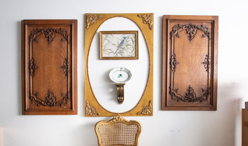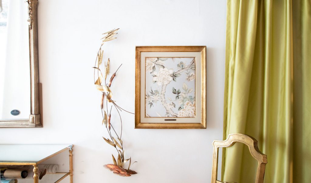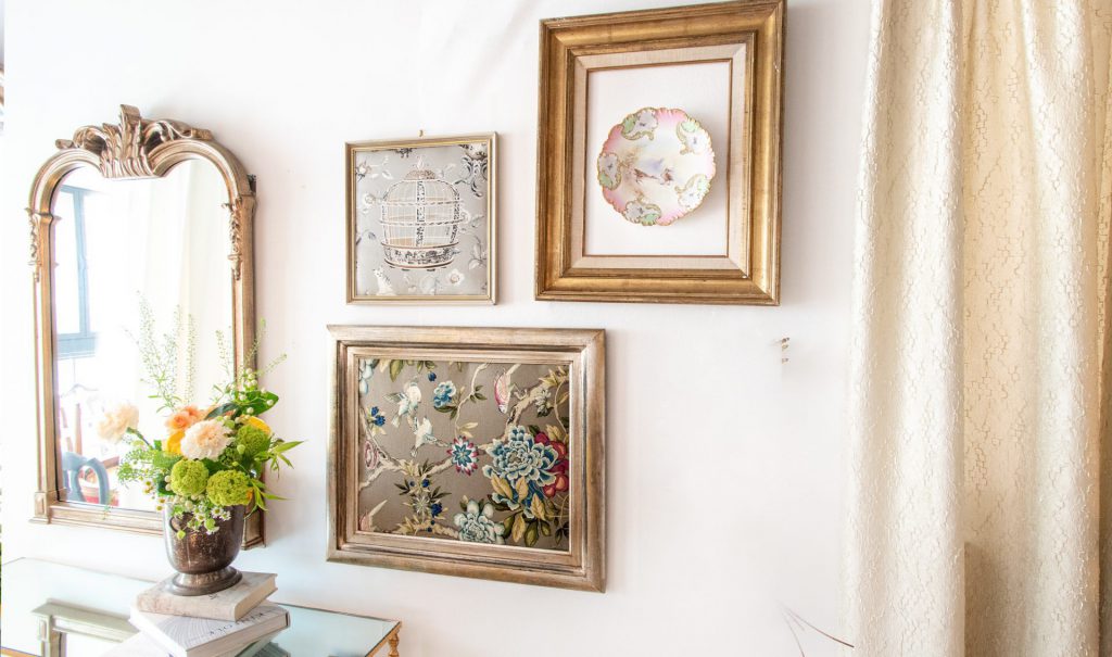 そして、シノワズリ!左側にある2つのフレームには、リサブレアのファブリックを貼り込んでいます。中綿を入れてぷっくりさせているので生地独特の柔らかさがあります。右上はフレームの中にお皿を掛けています。このフレームはそのままでもいいですし、写真の様に中にお皿を掛けたり、小さめのフォトフレームを入れてみたり、お好きに使える優れものです。