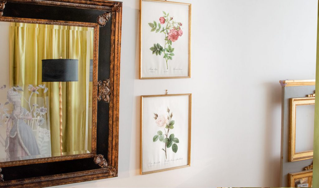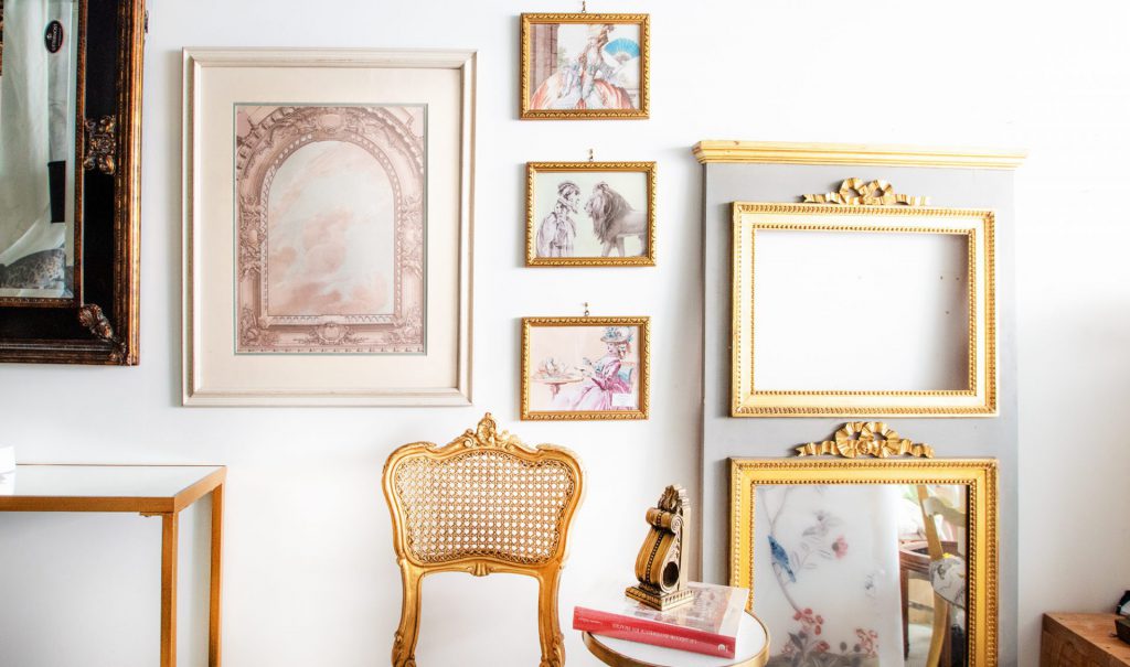 先ずは、ロマンチックなインテリア!私たちの代名詞となりつつ「乙女クラシック」←勝手に今ネーミング(笑)大小様々なフレームにアンティークチェアを合わせています。フレーム+アンティークチェアで一つの壁面はぐっと華やかになります。