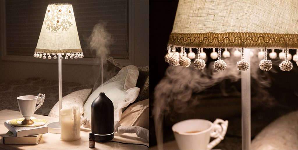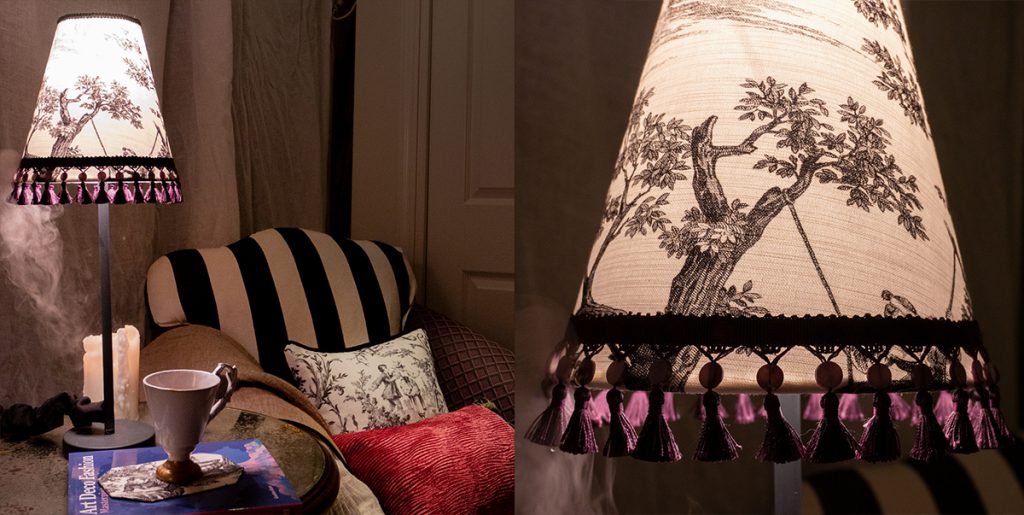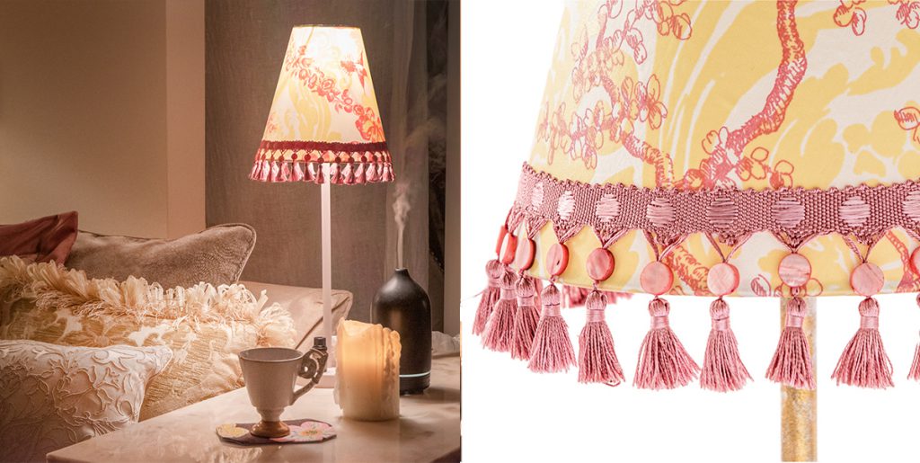 生地の選び方、シェードに付いたフリンジの組み合わせのセレクトは洗練されており、見ているだけで幸せになります。また実際にインテリアの中で撮影しているとやはりその存在感は見事であります。シェードサイズにも拘り特サイズでオーダーしました。もちろんスタンドは全てリサブレアで塗装をし、アンティーク加工や微妙なニュアンスカラーを使用している世界に一つだけのシェードをご紹介致します。