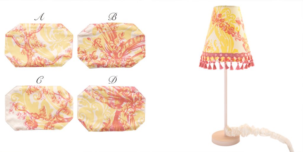 右の写真がこのランプシェード とお揃いのティーマット。生地をトリムする箇所によって表情が変わります。ファブリックで遊んで頂きたく今回は6種類限定で制作しております。
