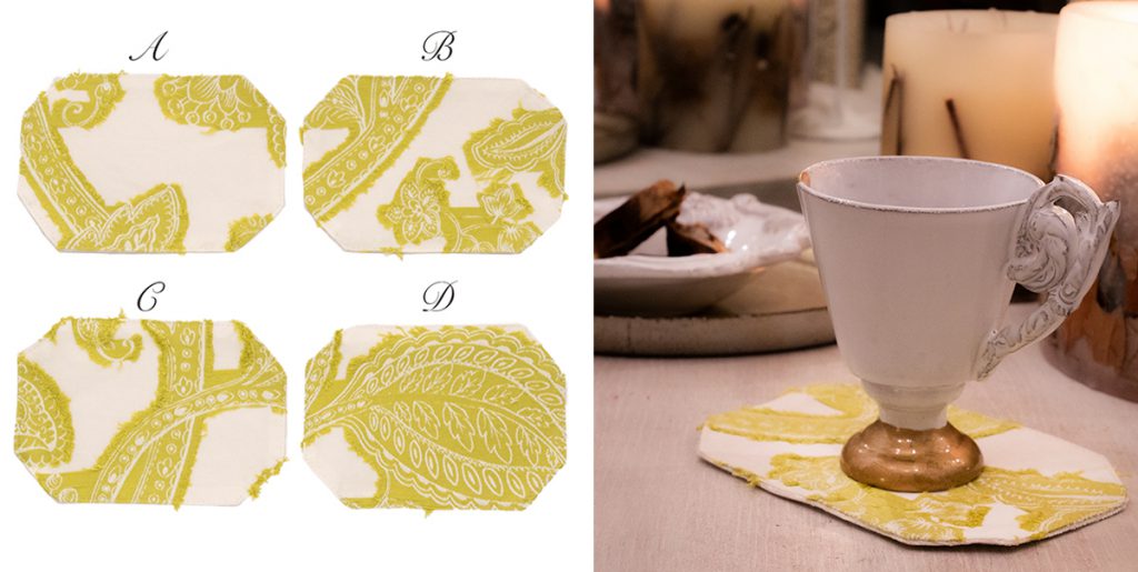 コチラもお揃いのティーコースターがありますよ!白のベース生地、グリーンのカットアウトされた生地のレイヤーになっているので、ランプシェードにした時の光の透過が美しいんです。
