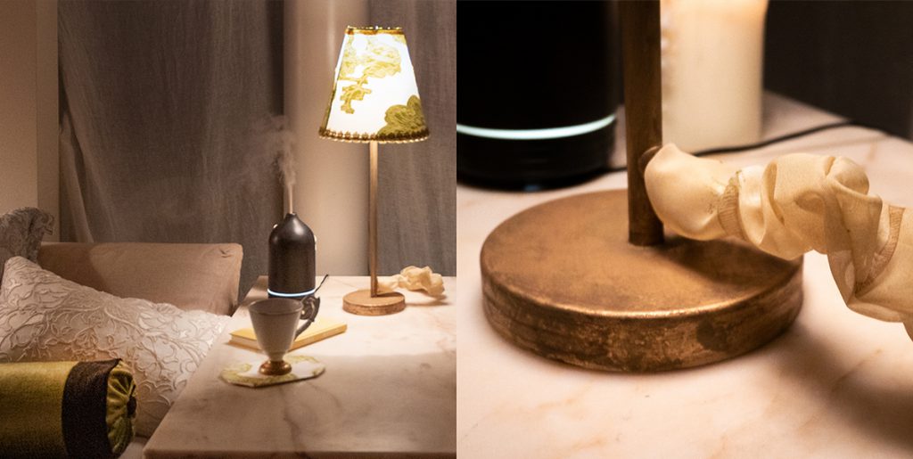 照明を付けるとグリーンの部分のデザインが浮かび上がってくる品のある美しい生地。照明から出てくるコードにカバーを付け、それもクシュっとして可愛いんです。