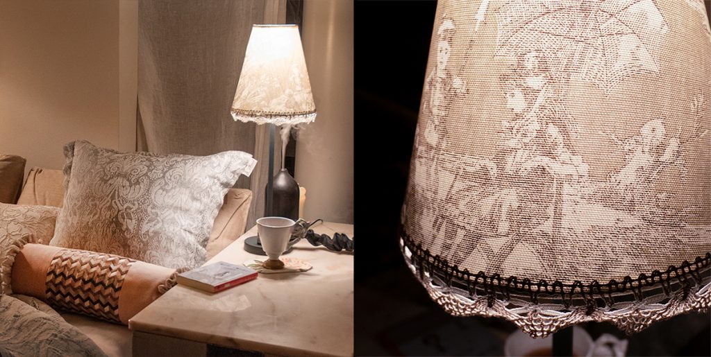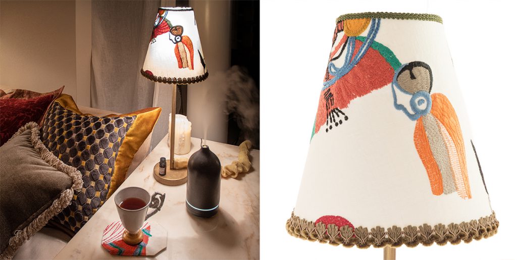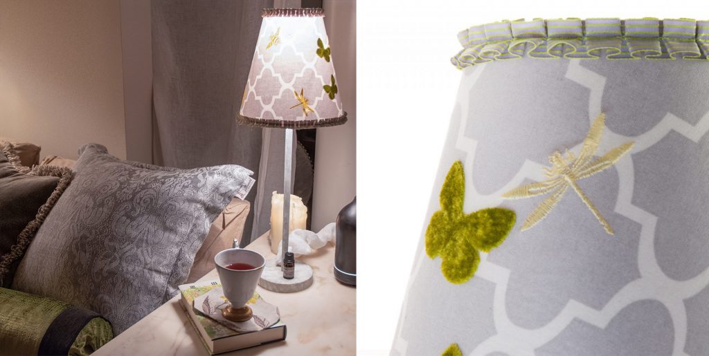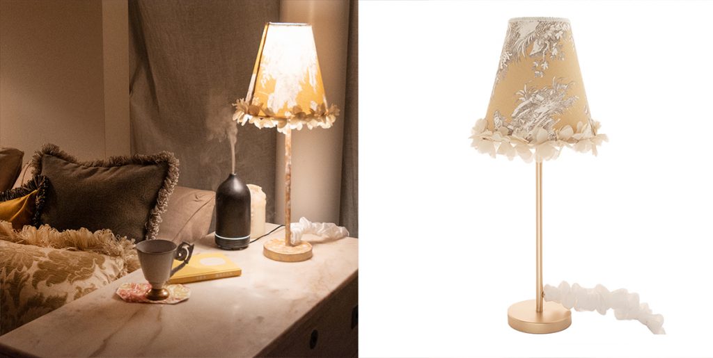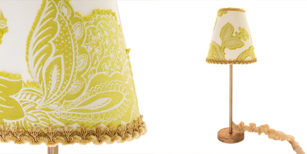 コチラは私たちの大好きな生地、フランス代表Pierre Freyの刺繍生地でつくったシェード。コチラもスタンドはアンティークゴールドです。