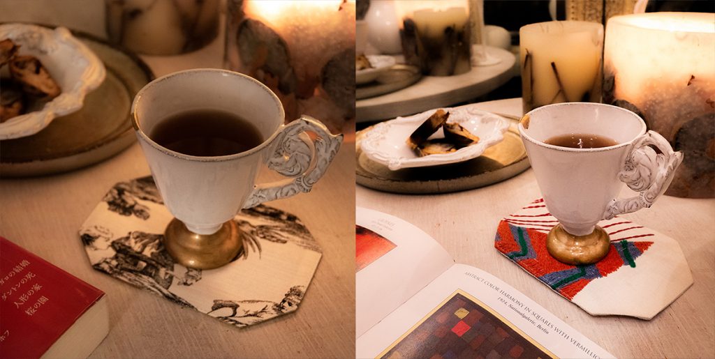 ランプシェードとお揃いで、ティーコースターも制作致しました。普通のコースターじゃつまらない!長方形で横にスナックをちょこっと置いたり、メガネやアクセサリーを置いて頂いてもいいですね。生地をトリムしているので、全て違うパターンなのでテーブル上のデコにもなりますね。