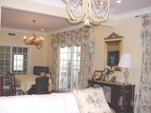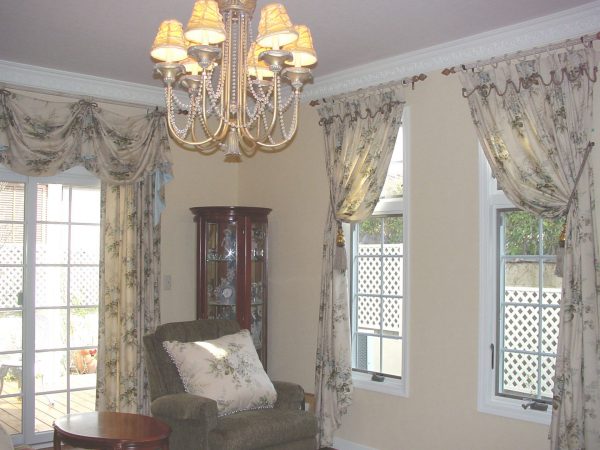 吐き出しの窓のウインドウトリートメントはキングストンバランスというスタイル。今ではシンプルなスタイルが主流となっているので、最近したことはないのですが、とても愛着があるウインドウトリートメントです
