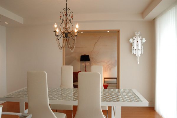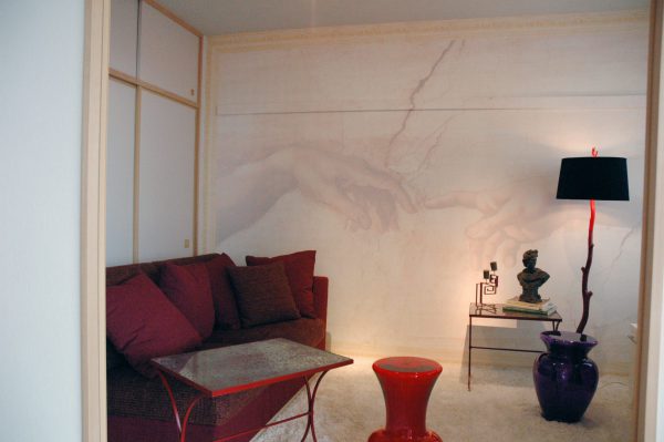 リサブレアで初めてデジタルプリントで施工させていただいたのがこの物件でした。2007年です。その時はリサブレアにはプリンターはなく外部にだしてプリントしてもらっていました。このお客様は新築マンションだったのですが、一部リフォームと家具などさせていただきました。リビング&ダイニングが広くないということで、リビング&ダイニングには大きなダイニングテーブルをおいて、和室をリビングにしました。床はそのままでカーペットを引き詰め、さて壁をどうするかとなって、どうしてこのミケランジェロのハンドの部分を取り入れたかというと、その時代感とかひび割れた新しくない感じ古い感じをだしたくて、これをえらびました。デジタルプリントで壁紙をする場合、特に住宅の場合は少しボケた感じ、リアルではない感じを出すためにかなり加工処理をします。