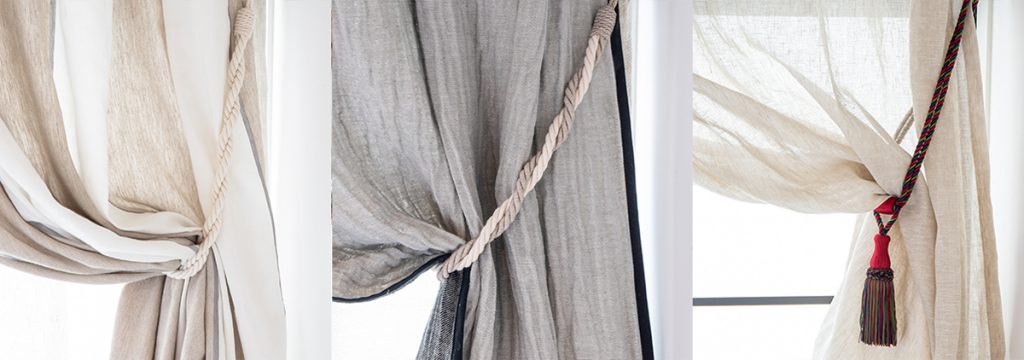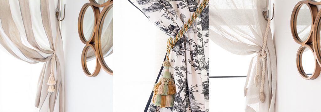上の写真の左と左から2番目のロープタッセルは使いやすく、お持ちのカーテンでスタイリングして遊べるアイテムです!