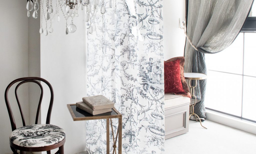 お部屋をロマンチックに変えてしまう魔法のスタイリング。モノクロの生地は一見取り入れにくいと考えられがちですが、カーテンをアクセントとして使いレースやクッション、家具をパステルカラー+グレーに揃えると、インテリアに優しい空気が流れます。またプロがデザインする様なコーディネートが簡単にできてしまいますよ!
