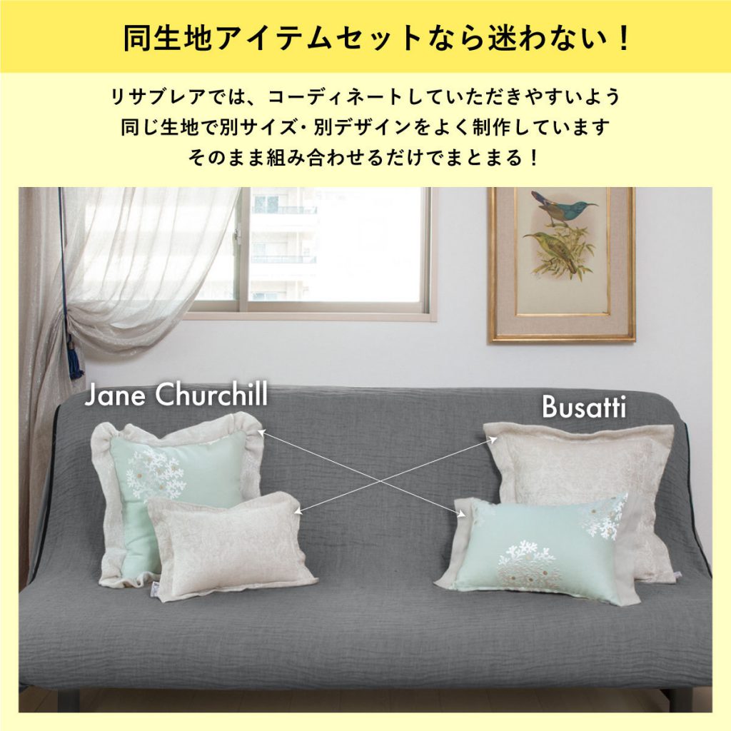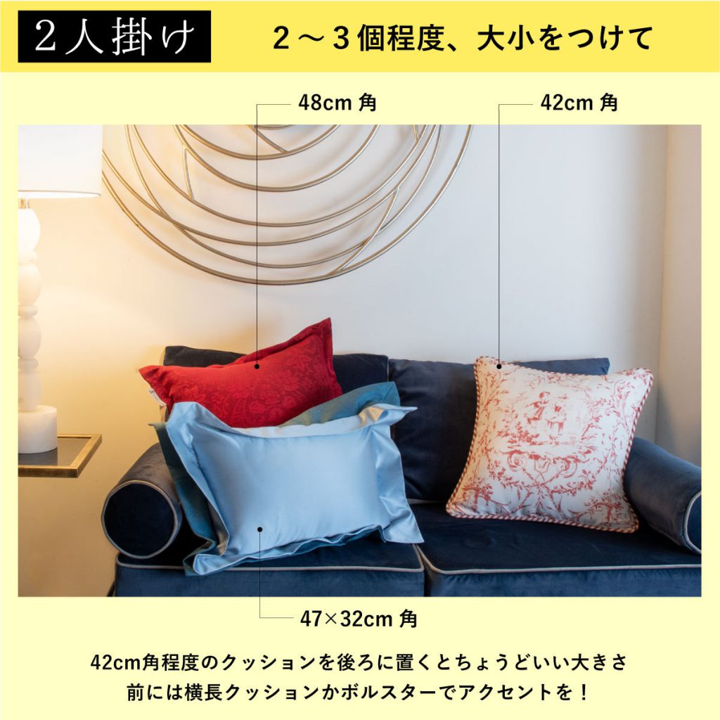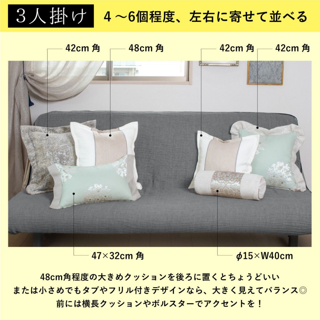 2人掛けより幅が随分広いので、その空間を活かし大小+ボルスターを組み合わせるとリズム感が出てきます。正方形サイズは上の写真にサイズが書いてありますが、弊社のクッションは周りにフリルやタブと呼ばれるデザインがございますので、ボリューム感で比較しながら見て頂けると良いかもしれません。