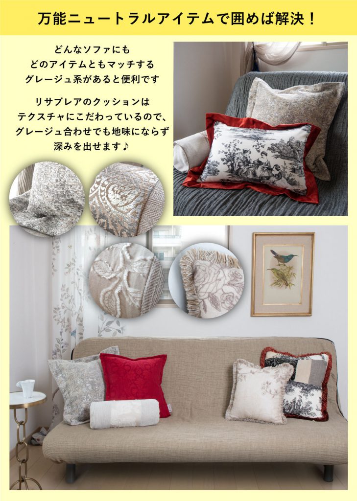 どんなクッションを置けばいいのか分からない… という方には「2種類の生地と2種類のサイズ」を合わせてみると玄人感が出てきます。ポイントは同じクッションを並べない!というリサブレア的な考え方。デザインやサイズを変えながら自分流のインテリアづくりをして頂ければ幸いです。素材感は一概には言えませんが、マット系や光沢系をまとめて頂くと統一感が出ます。