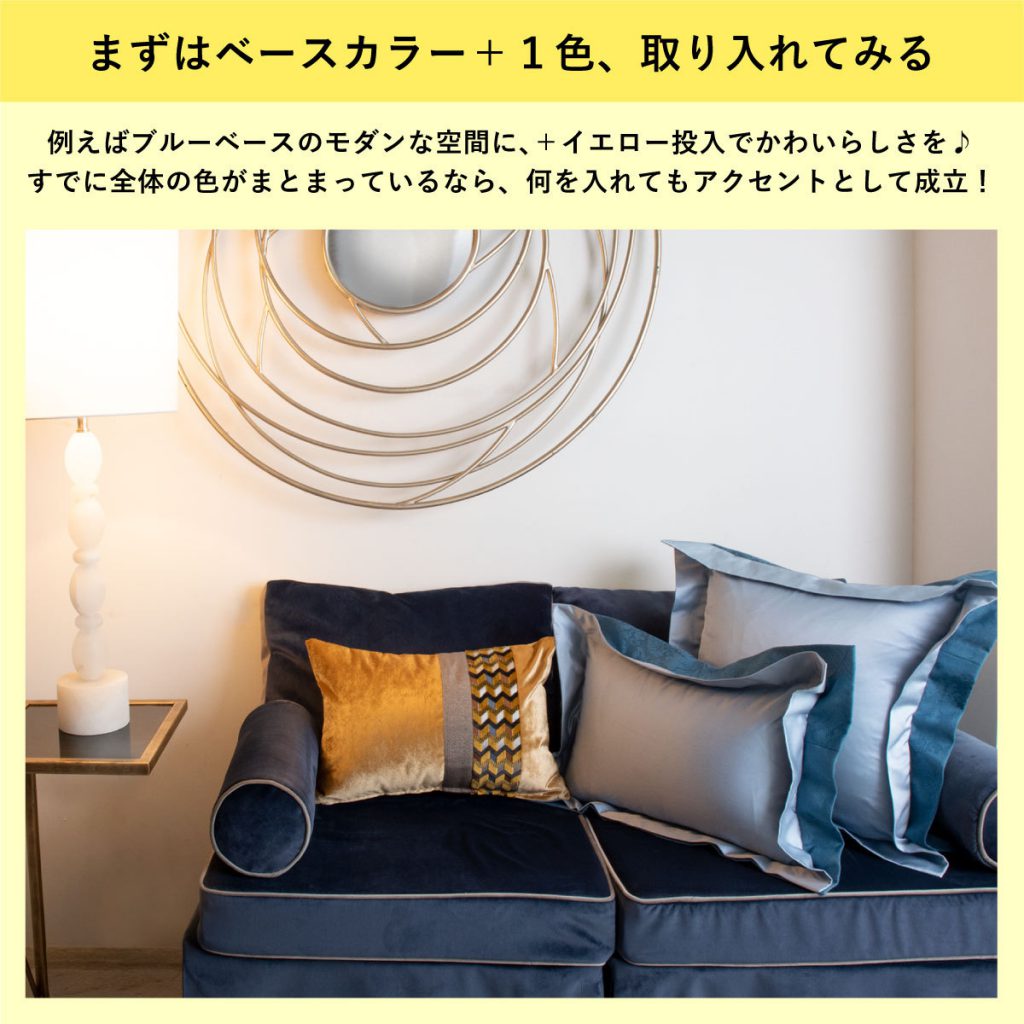 お持ちのソファの色味に合わせたクッションをベースカラーとし、+1色を取り入れてみて下さい!