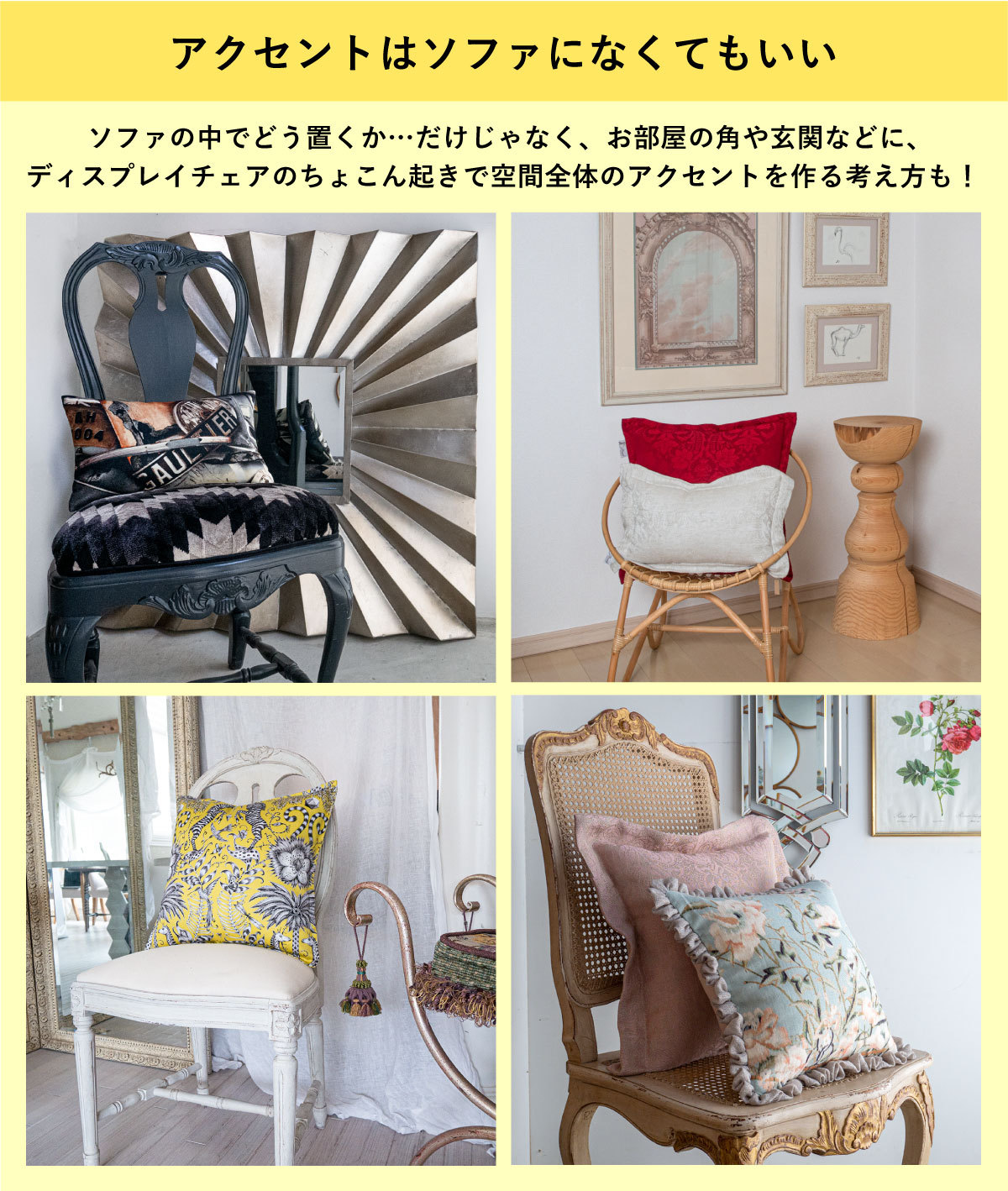 アクセントクッションは必ずしもソファに置く必要はなく、お気に入りの椅子の上にちょこんとアートの様に飾って頂いてもいいんです。