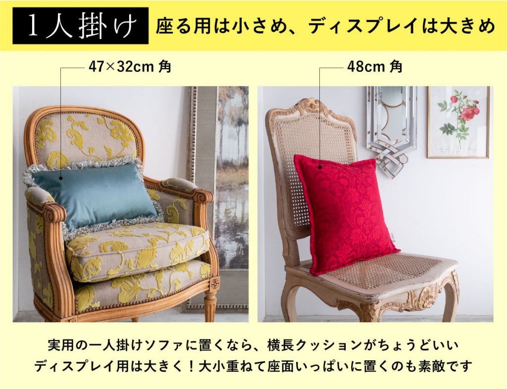 一人掛けソファには長方形サイズがオススメ。座る時にも腰当てとなるので嬉しいですね。又、弊社では一人掛けのアンティークチェアをお部屋の隅にインテリアデコレーションとして置いて頂くことをオススメしております。お部屋の隅はデットスペースになりがち… グリーンを置く感覚でチェアを置き、その上にクッションを合わせると、フォーカルポイントになりますね!ご自身のお持ちの椅子サイズを測り、適切なサイズをお選び頂ければと思います。