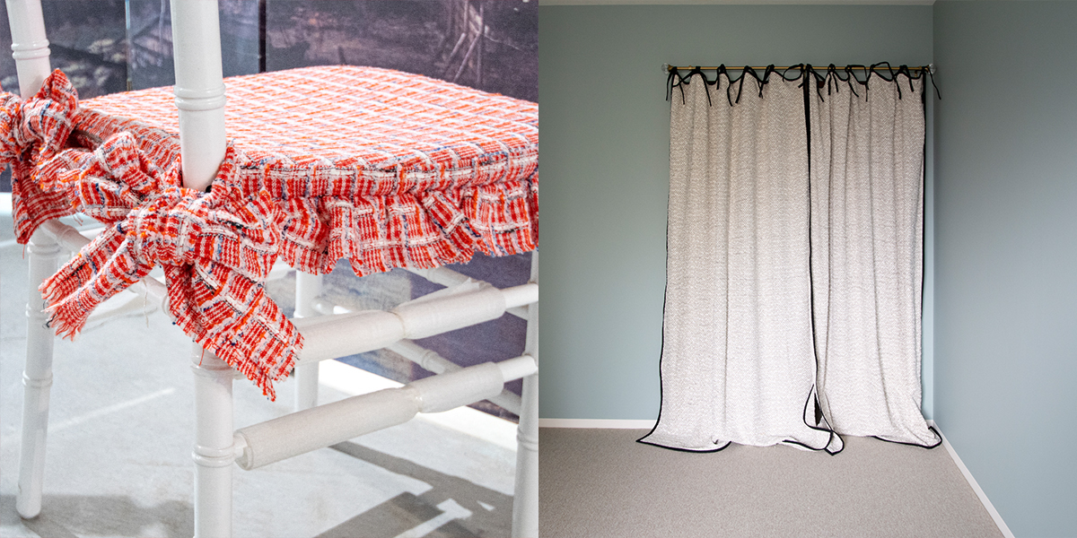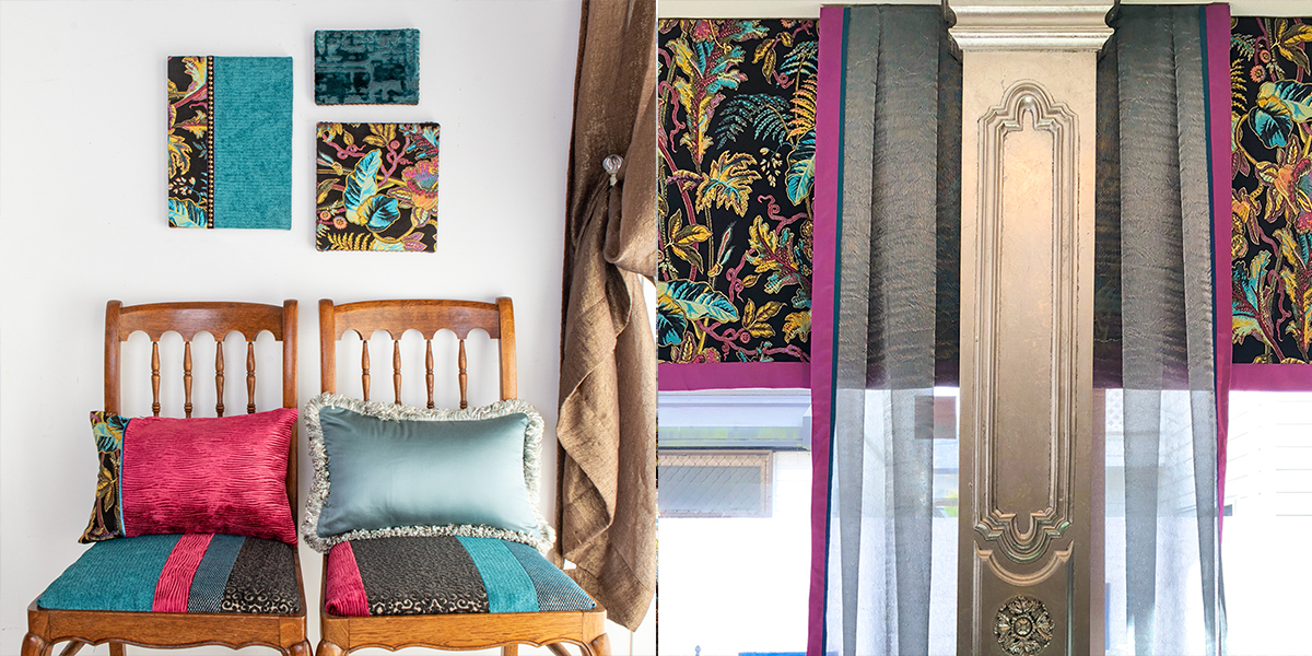 真ん中はファブリックパネル、右端は椅子貼りに使わせて頂きました。サイズ感による印象の違い、光による色味の変化を感じて頂けるかと思います。