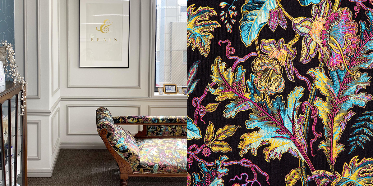 上の左の写真は、アンドブレイン様の事務所。最初は「この生地は派手すぎないか?」とご心配されていましたが、全てをコーディネートした後にはお客様に大好評だと喜んで頂いてます!