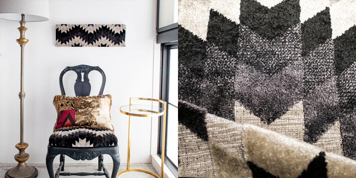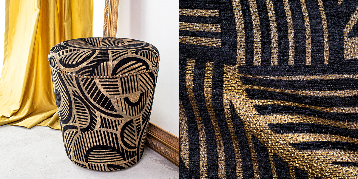 コチラはアール・デコのジオメトリック生地。錦糸とブラックの2色のジャガード織りは大変高級感があり、お部屋をぐっとモダンにアップグレードしてくれます。一つの柄が大きく、実際に貼るとその大きなデザインが強調されインテリアの主役級の存在感を放ちます。この生地からインテリアを組み立ててみる… そんな試みも楽しそうなワクワクするファブリック。