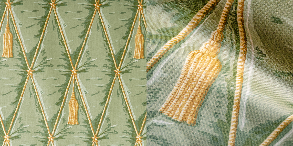 クラシカルな雰囲気もありながら、今見ても新鮮なこのタッセル柄は私たちのお気に入り!インテリアとしても馴染みが良い落ち着いたグリーンです。
