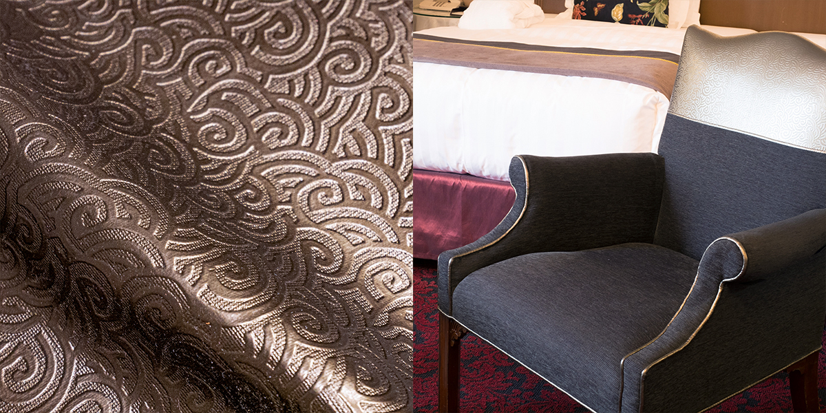 左が実際に椅子に貼ったお写真。光を反射する為、施工写真を見て頂くと随分印象が変わります。写真のように素材感の違う生地と合わせることにより、素材の良さを引き出す事ができます。