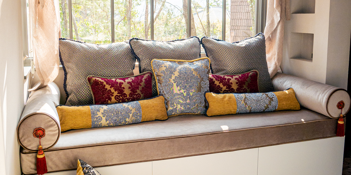 お客様のご自宅に先ほどの生地の色違い、デザイン違いの生地で制作したクッション達。こんな色の組み合わせも素敵ではないでしょうか?