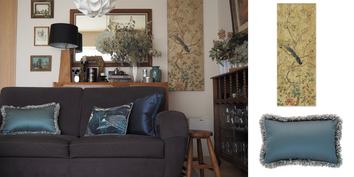 左上の写真はデザ子さんから頂いたモノ。ソファ右に置いてある右の紺色のシノワズリクッションは以前弊社にてお買い求め頂きました。背面に見えるのは1年ほど前にご購入頂いたシノワズリのアートパネルです。今回デザ子さんのお家のコレクションに加えて頂いたのは、ソファ左側にあるクッション。