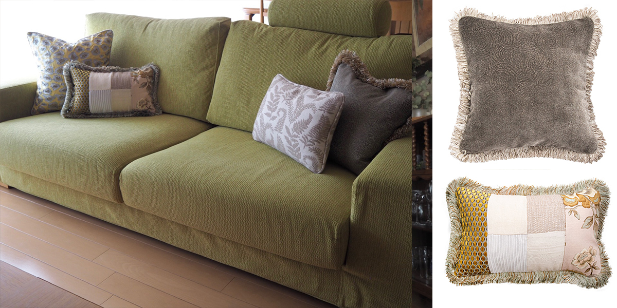 このグリーンの2人掛けソファに対して、4個のクッションをレイアウトされています。今回新しく加えて頂いたのは、右の四角形と左から2番目の長方形のクッション。グレージュ〜ベージュ、アクセントとしてイエローがバランス良く配置されています。