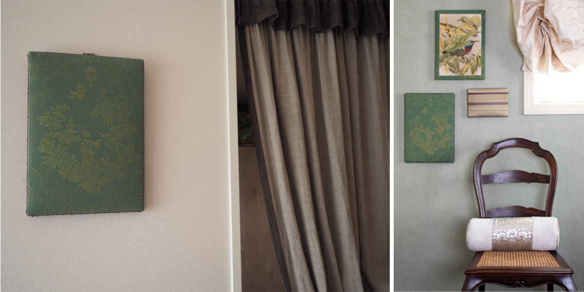 そして、最後はシノワズリ生地のファブリックパネル。こちらは恐らくグリーンのソファの背面にくる壁かと思われます。
