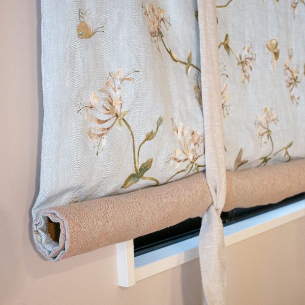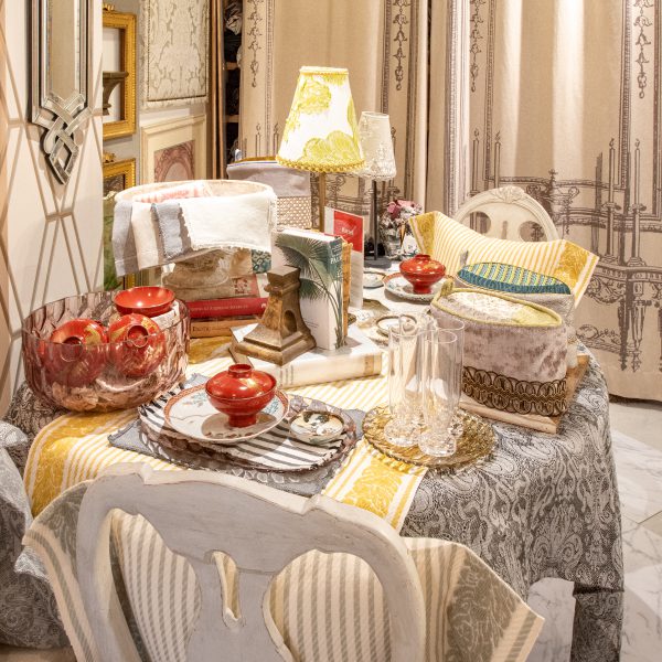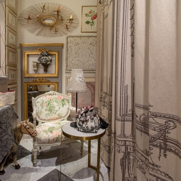 続いては、ソファコーナー!Colefax&Fowler(イギリス)のイチオシ新作、ハニーサックル柄の刺繍生地をたっぷり見せたくて、ナチュラルエレガントなコーナーを作りました。