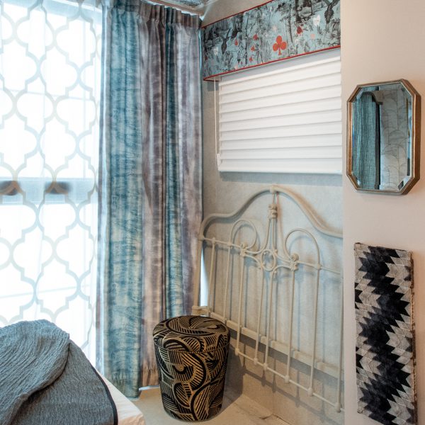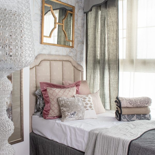 その奥にはベッドコーナー。Busatti(イタリア)の天然ファブリックをふんだんに生かしたエレガントな空間に。