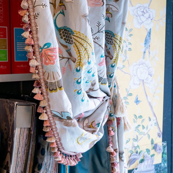 ピーコックカラーの裏地・ピンクフリンジをつけて甘いカーテンに仕立てました。