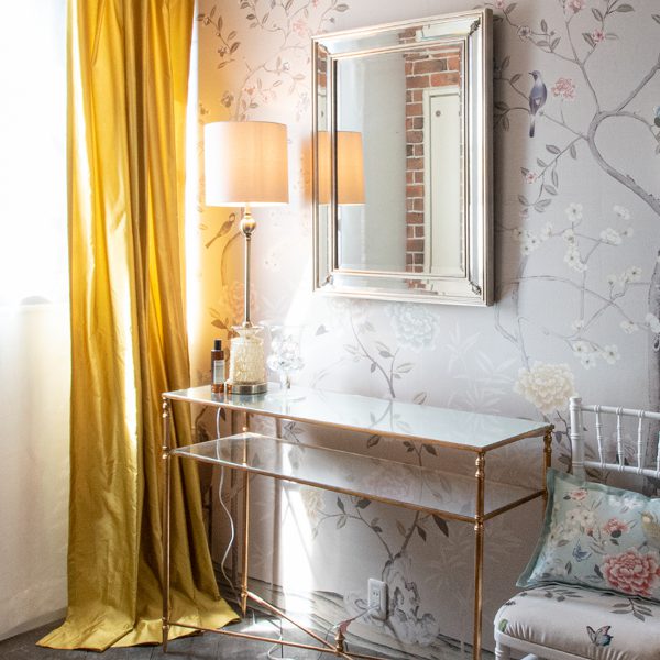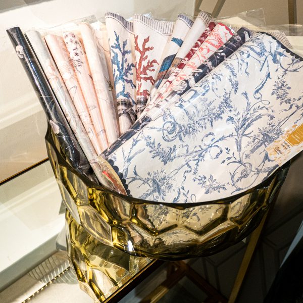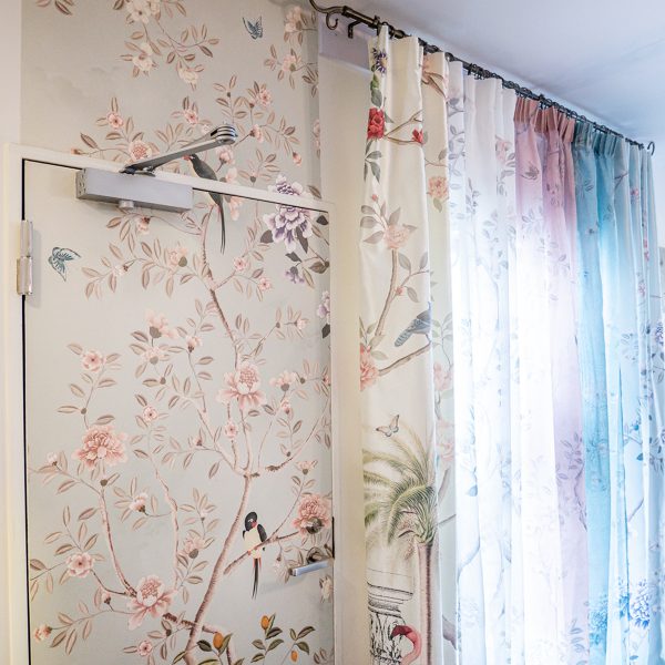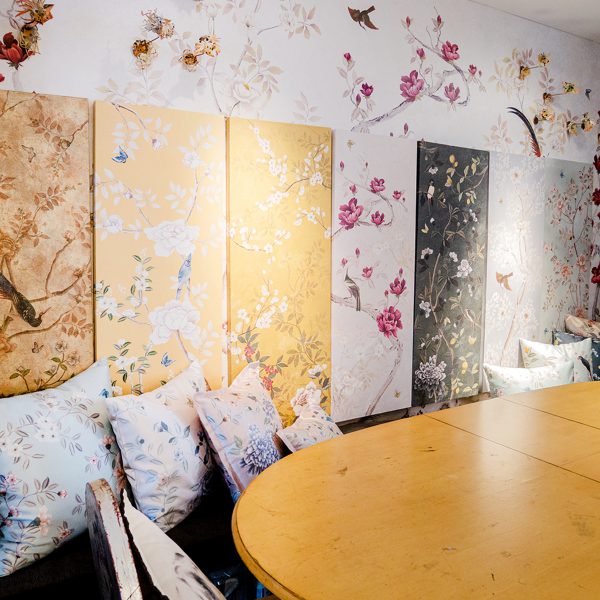 貼って剥がせる壁紙シールや、カーテンサンプルも。シノワズリをご検討のお客様は、ここでサンプルをご覧いただきながら打ち合わせをしています。