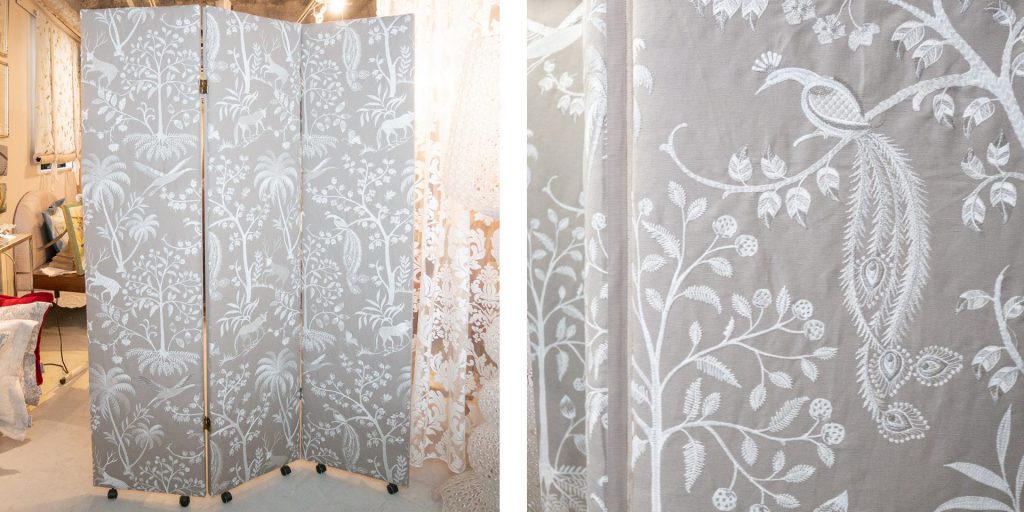 さりげなく見切れていたパーティションも実はとっておき!JaneChurchillのジャングル柄刺繍生地は、近くで見るとキラッとシルバー色が輝いてエレガント。