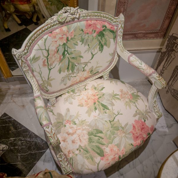 リネンで椅子張りに使える強度の生地は珍しく、水彩の花柄も繊細で美しい…ホワイトシャビーなアンティークチェアに相性バッチリのかわいさです!