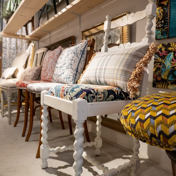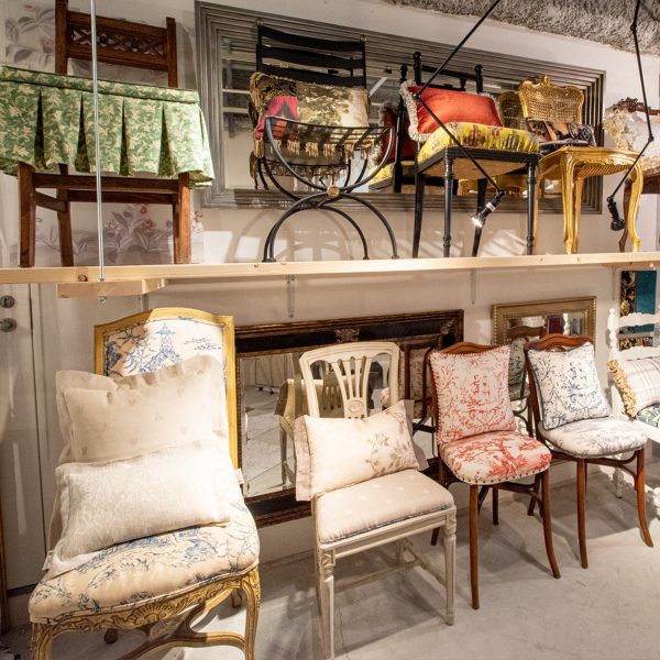いよいよショールームの中へ!まずはアンティークチェアがズラリ。